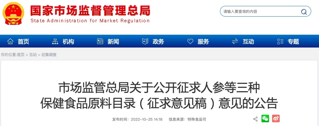 為進一步推進保健食品備案工作,根據(jù)《中華人民共和國食品安全法》,市場監(jiān)管總局組織制修訂了人參等三種保健食品原料目錄(征求意見稿),現(xiàn)面向社會公開征求意見,意見建議反饋截止時間為2022年11月25日。公眾可以通過以下途徑和方式提出意見建議:
