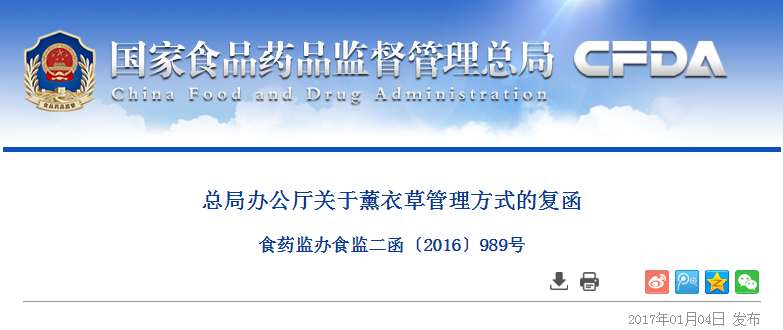 你局《關(guān)于明確薰衣草管理方式的請示》(冀食藥監(jiān)〔2016〕51號)收悉。經(jīng)商農(nóng)業(yè)部和衛(wèi)生計生委,現(xiàn)函復(fù)如下: