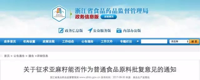 根據(jù)杭州市市場監(jiān)督管理局《關(guān)于亞麻籽是否可以作為普通食品原料的請示》(杭市管[2017]128號),省局答復(fù)如附件,現(xiàn)面向公眾征求意見,公示時間為2017年8月30日至2017年9月7日,如有意見請于公示結(jié)束前反饋,聯(lián)系電話:0571-81393572;傳真號碼:0571-81393576,電子郵箱:8509034@qq.com。